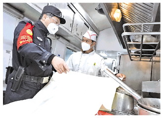 圖為張朝華對(duì)列車餐車的消防設(shè)備進(jìn)行檢查。 通訊員 茍國力 攝
