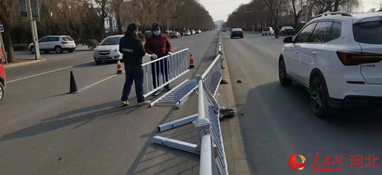 工作人員接到群眾反映后到達(dá)現(xiàn)場(chǎng)維修護(hù)欄。 劉利勇攝