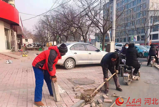 工作人員接到群眾反映后到達(dá)現(xiàn)場(chǎng)維修馬路地磚。 李堯攝
