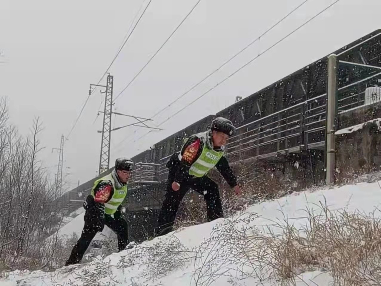 為積極應(yīng)對(duì)冰雪天氣,確保旅客平安出行,大同鐵路警方全警奮戰(zhàn)在鐵路安全保障的第一線,成為雪景中一道靚麗風(fēng)“警”線。圖為民警對(duì)線路重點(diǎn)區(qū)段、重點(diǎn)部位巡邏檢查。 東海 攝