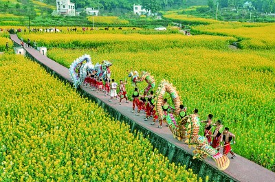 四川瀘州市瀘縣喻寺鎮(zhèn)譚壩村,國家級非遺雨壇彩龍在油菜花海中翻騰。劉國興攝/光明圖片