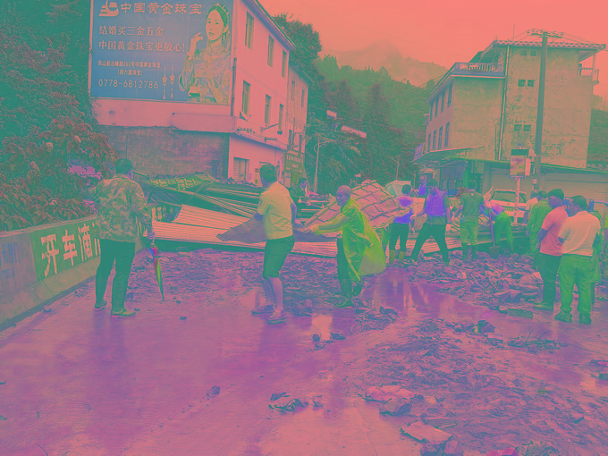 6月13日,廣西壯族自治區(qū)鳳山縣喬音鄉(xiāng)一座倉庫被雨水沖塌,多間商鋪和居民樓受到影響,道路交通受阻,鳳山縣公安局立即組織警力展開救援。(鳳山縣公安局提供)