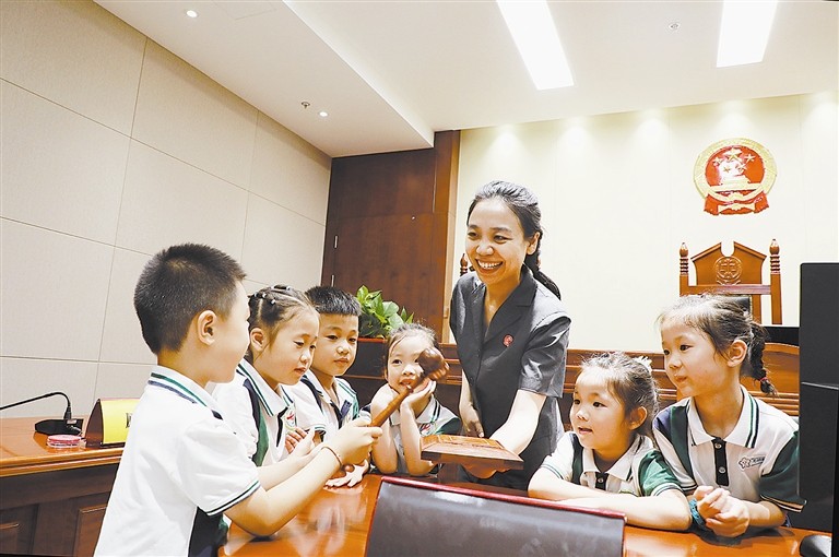 日前,浙江省江山市人民法院開展了暑期開放日活動,江山市城東實(shí)驗(yàn)學(xué)校、城東幼兒園50余名少年兒童走進(jìn)法院,先后參觀了訴訟服務(wù)大廳、審判法庭等場所,詳細(xì)了解人民法院工作職責(zé)、審判法庭基本設(shè)置,近距離體驗(yàn)庭審活動,接受了一次生動、直觀的法治教育。圖為同學(xué)們在了解法槌的相關(guān)知識。