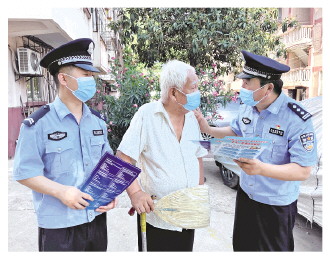 圖② 曹金生(右一)向轄區(qū)老人宣傳防范養(yǎng)老詐騙知識。