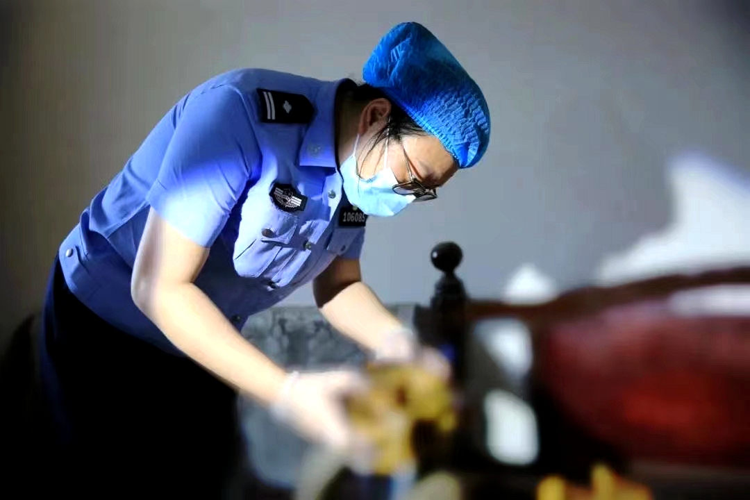 一副手套一個(gè)口罩,沒有防毒面具沒有防護(hù)服,在場(chǎng)的同事都為這名剛剛穿上白大褂的“黃毛丫頭”捏了一把汗。查看了現(xiàn)場(chǎng)環(huán)境之后,她時(shí)而站立時(shí)而俯身進(jìn)行拍照,觀察尸斑、尸僵以及腐敗的程度,最后蹲在了尸體前,側(cè)身從勘查箱中拿出鑷子、放大鏡、試管以及證物袋等工具,尋找可能存在的傷痕點(diǎn),小心翼翼地提取血液、體液以及殘留物,結(jié)合氣候和室內(nèi)環(huán)境給出綜合判斷。隨著時(shí)針滴答滴答向前,死者生前受侵害的可能性逐步被排除,真相也在逐步走近——“死者生前沒有受到侵害的跡象,基本可以排除他殺可能”。就在所有人都屏息凝視的時(shí)候,龐宜婧堅(jiān)定地回答打破寂靜。