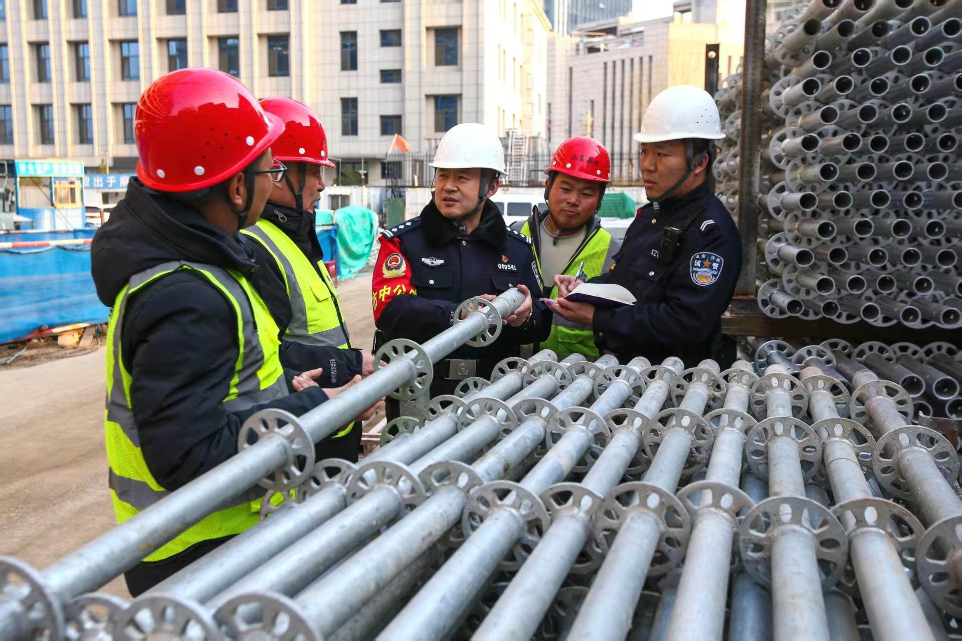 2月18日,山東省濟(jì)南市公安局市中區(qū)分局六里山派出所組織社區(qū)民輔警走進(jìn)轄區(qū)建筑工地,通過開設(shè)“法治課堂”,向工人宣傳反電詐反邪教和安全生產(chǎn)常識(shí),護(hù)航企業(yè)復(fù)工復(fù)產(chǎn),提高工人的安全防范意識(shí)。圖為民輔警向工人了解安全生產(chǎn)情況。