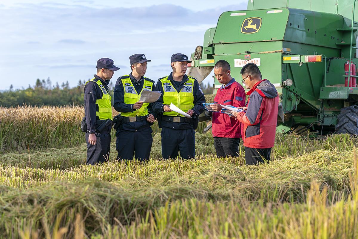11月11日,上海市公安局崇明分局長江派出所組織民警走進田間地頭,向收割晚稻的農(nóng)戶們開展防盜防騙、交通安全提示等宣防工作。