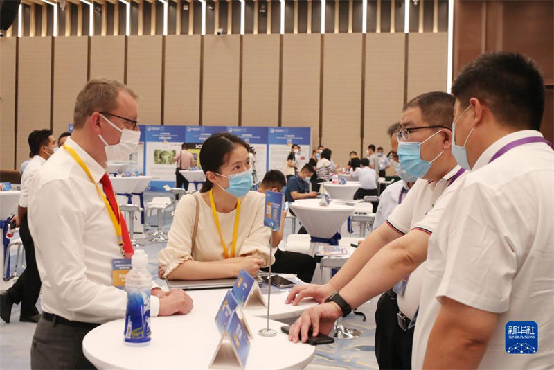 在第五屆中國國際進(jìn)口博覽會(huì)技術(shù)裝備展區(qū)展前供需對接會(huì)上,參展商代表(前左二)向采購商介紹企業(yè)產(chǎn)品情況(2022年8月8日攝)。新華社記者 方喆 攝