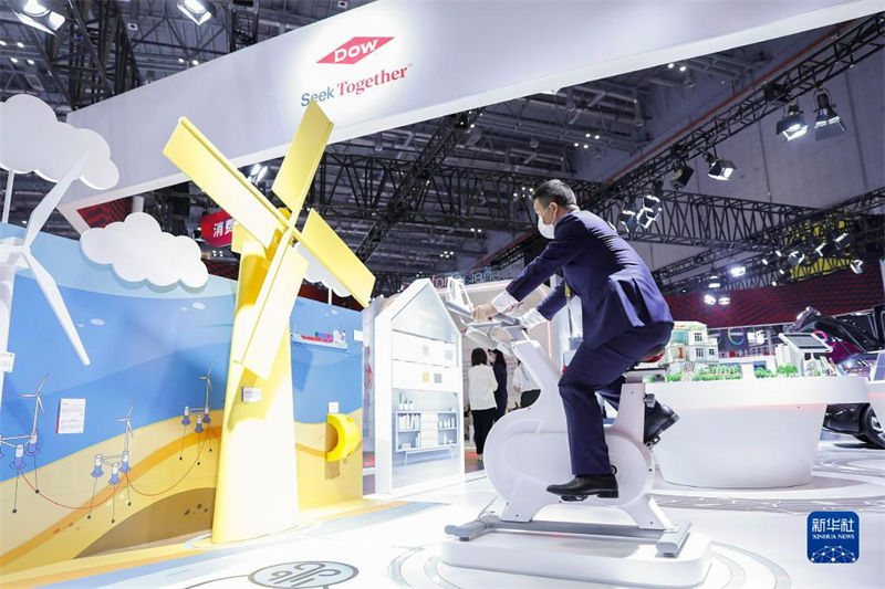 2021年11月5日,工作人員在第四屆中國國際進(jìn)口博覽會(huì)能源低碳及環(huán)保技術(shù)專區(qū)一展臺(tái)演示環(huán)保發(fā)電互動(dòng)裝置。新華社記者 張玉薇 攝