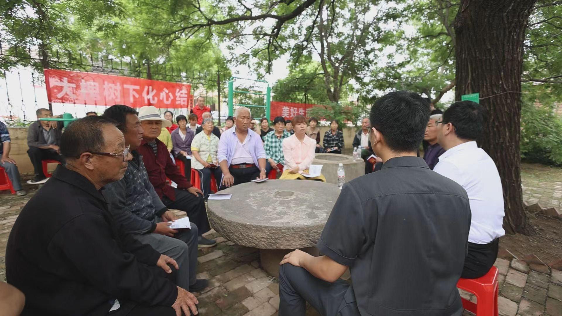 圖為平原縣張華鎮(zhèn)郝堂村口開(kāi)展“大槐樹(shù)下講講理”活動(dòng)。