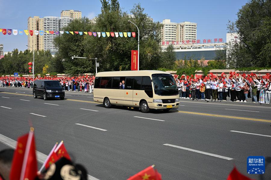 9月23日下午,中共中央總書記、國家主席、中央軍委主席習(xí)近平率中央代表團(tuán)乘專機(jī)抵達(dá)烏魯木齊,出席新疆維吾爾自治區(qū)成立70周年慶?;顒?dòng)。這是從機(jī)場到住地途中,習(xí)近平向沿途歡迎的群眾揮手致意。新華社記者 辛悅衛(wèi) 攝
