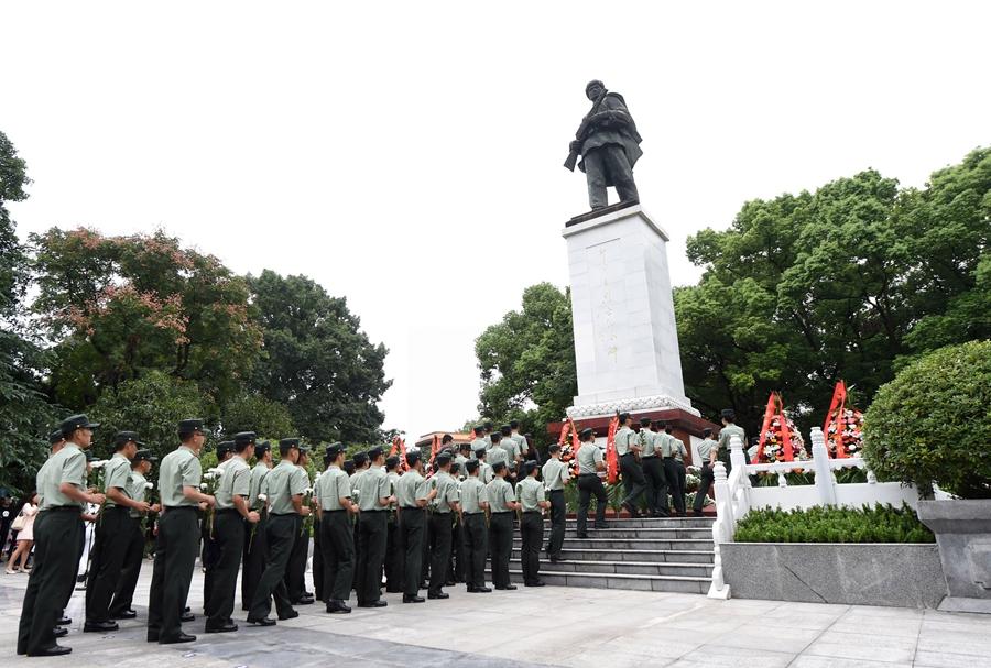 在位于重慶市銅梁區(qū)的邱少云烈士紀(jì)念館,武警官兵向邱少云烈士紀(jì)念碑獻花(2017年9月30日攝)。新華社記者 唐奕 攝
