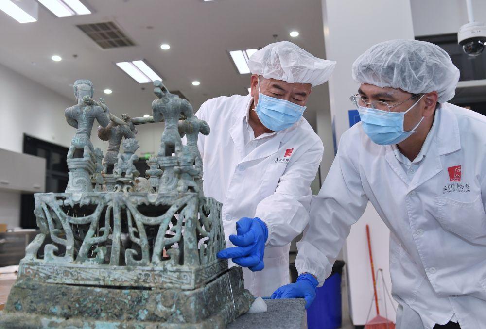 2023年5月30日,在四川三星堆博物館文物保護(hù)和修復(fù)中心,文物修復(fù)師郭漢中(左)與同事討論神壇底座修復(fù)方案。郭漢中從事文物修復(fù)工作已40余年,深度參與了三星堆祭祀坑的發(fā)掘工作,累計(jì)修復(fù)文物6000余件。“大概還有上萬件文物等著修復(fù),需要一代接著一代往下干。”郭漢中說,他要把平生所學(xué)傳承下去,培養(yǎng)更多人才。