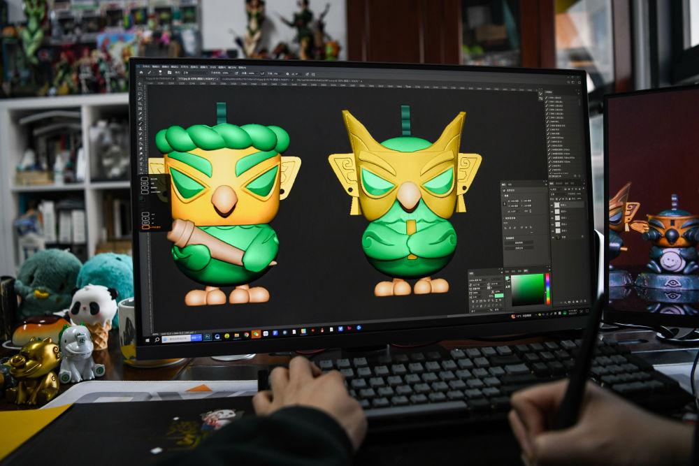 2025年3月1日,文創(chuàng)產(chǎn)品策劃運(yùn)營(yíng)師曾舟在位于四川成都的辦公室內(nèi)完善文創(chuàng)產(chǎn)品細(xì)節(jié)。他以三星堆青銅神樹、青銅縱目面具、青銅獸面等文物為創(chuàng)作藍(lán)本,結(jié)合潮玩元素設(shè)計(jì)的文創(chuàng)作品廣受歡迎?!拔蚁胱龅牟皇峭婢呖煜罚怯袃?nèi)容、有溫度、有意義的文化IP,讓年輕一代隨手摸到沉淀千年的文化?!痹壅f。