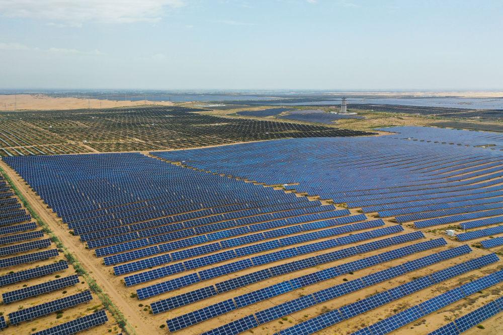這是2025年9月10日在內(nèi)蒙古庫(kù)布其沙漠拍攝的達(dá)拉特旗光伏基地。該基地將治沙與新能源產(chǎn)業(yè)相融合,在庫(kù)布其沙漠腹地實(shí)現(xiàn)了“板上發(fā)電、板下種植、板間養(yǎng)殖”的立體生態(tài)循環(huán)模式。2025年,一塊塊藍(lán)色光伏板在北疆構(gòu)筑起一道一望無(wú)際的“光伏長(zhǎng)城”,成為生態(tài)治理、經(jīng)濟(jì)發(fā)展的堅(jiān)實(shí)屏障。
