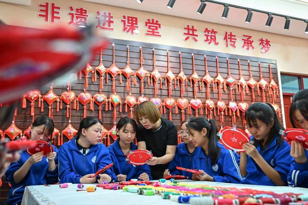 2025年9月26日,內(nèi)蒙古興安盟科右中旗巴彥呼舒第六中學(xué)美術(shù)教師、非遺傳承人吳斯琴(左四)指導(dǎo)學(xué)生刺繡。近年來,學(xué)校將當(dāng)?shù)貒壹壏沁z圖什業(yè)圖刺繡引入校園,開設(shè)課程,并成立興趣社團,讓學(xué)生們近距離感受非遺的魅力,弘揚和傳承傳統(tǒng)文化。