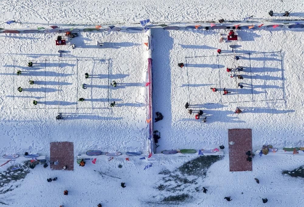 2025年12月25日,人們?cè)诘诎藢霉枮I松花江冰雪嘉年華園區(qū)內(nèi)體驗(yàn)冰上排球(無(wú)人機(jī)照片)。本屆冰雪嘉年華推出近60項(xiàng)特色項(xiàng)目,為市民與游客打造多樣化的冰雪體驗(yàn)。