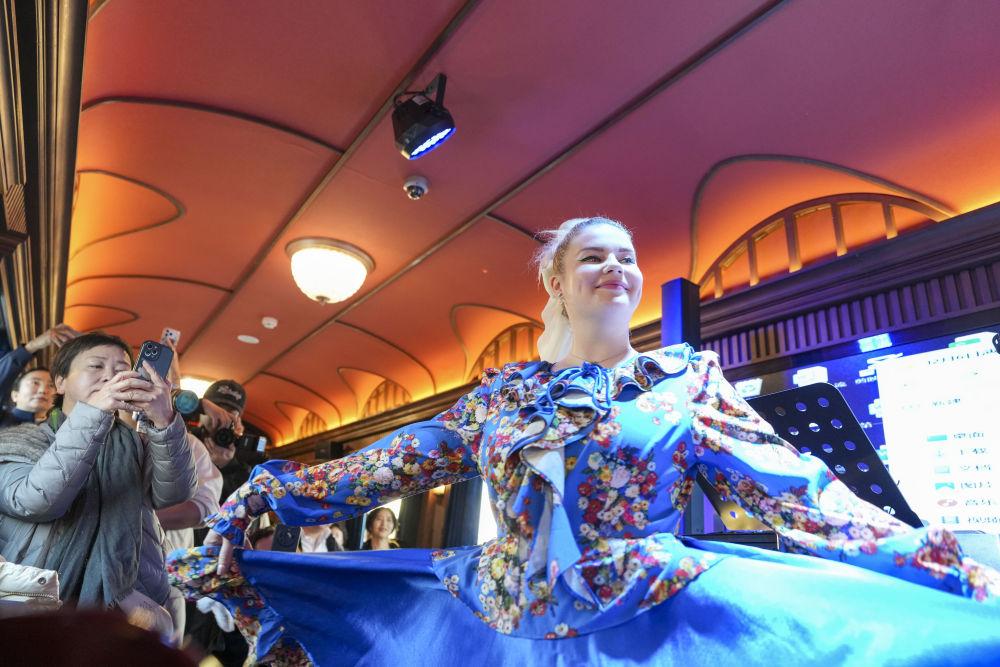 2025年12月6日,演員在黑龍江省“伊春號(hào)”旅游專列車廂中表演。當(dāng)日,“伊春號(hào)”旅游專列投入試運(yùn)行,40余名受邀體驗(yàn)的游客乘專列由哈爾濱站出發(fā),去往亞布力滑雪旅游度假區(qū)。2025年以來(lái),中國(guó)鐵路哈爾濱局集團(tuán)有限公司陸續(xù)開行了多趟旅游列車,將特色體驗(yàn)、民俗展示、定制化服務(wù)等進(jìn)行融合,滿足游客需求,服務(wù)旅客出行。