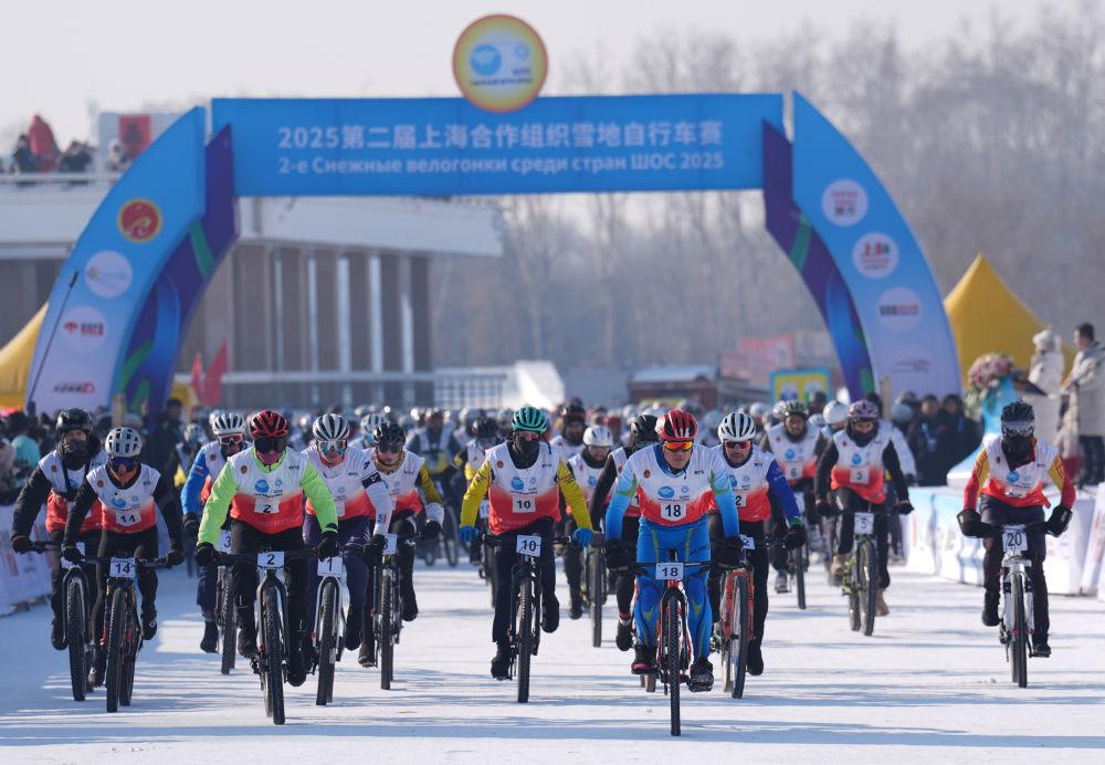 2025年1月11日,選手在哈爾濱太陽(yáng)島風(fēng)景區(qū)參加2025第二屆上海合作組織雪地自行車賽。