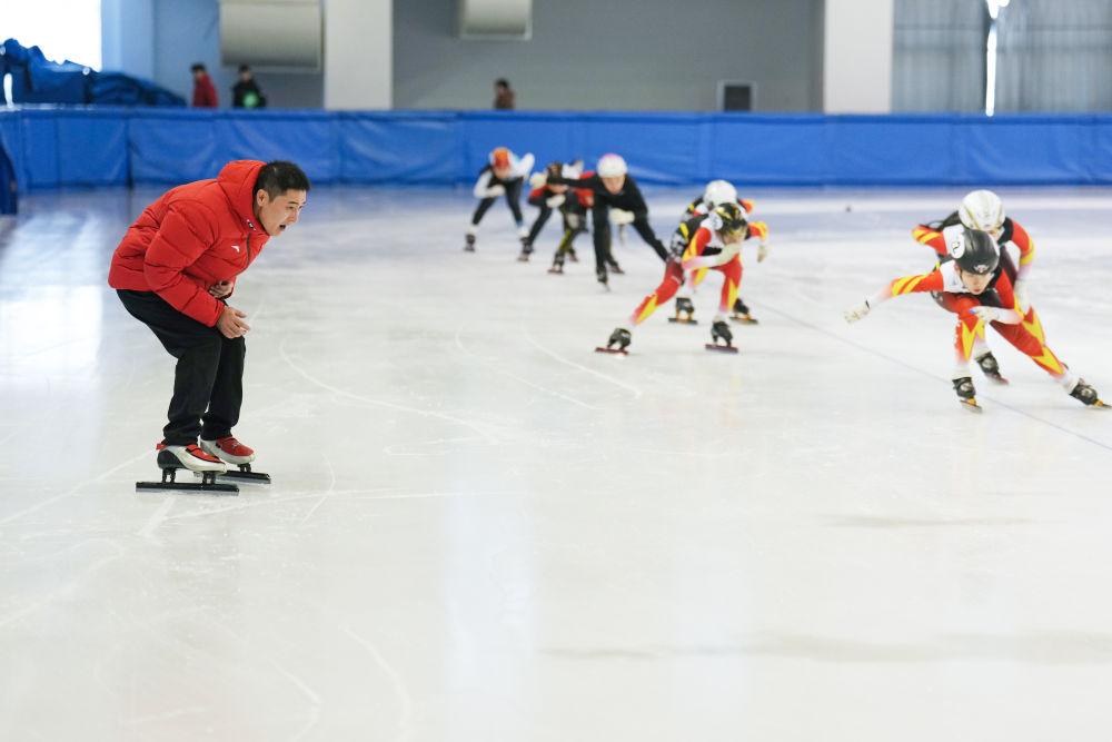 2025年1月24日,短道速滑教練姚忠華(左)在黑龍江省七臺(tái)河市短道速滑館指導(dǎo)運(yùn)動(dòng)員進(jìn)行冰上訓(xùn)練。十余年來(lái),姚忠華累計(jì)執(zhí)教培養(yǎng)過(guò)200余名運(yùn)動(dòng)員。七臺(tái)河市擁有“奧運(yùn)冠軍之城”的城市名片,在這里,教練員們一起筑夢(mèng)冰場(chǎng),為我國(guó)冰雪人才的儲(chǔ)備奉獻(xiàn)自己的力量。