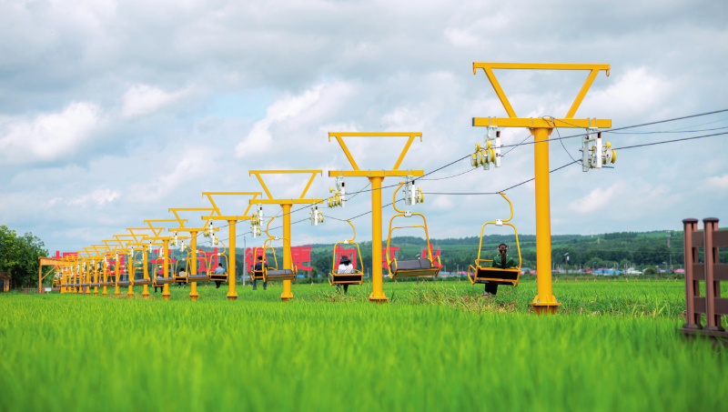 在吉林省和龍市光東村,游客乘坐稻田低空纜車游覽(2025年7月18日攝)。邵澤東攝