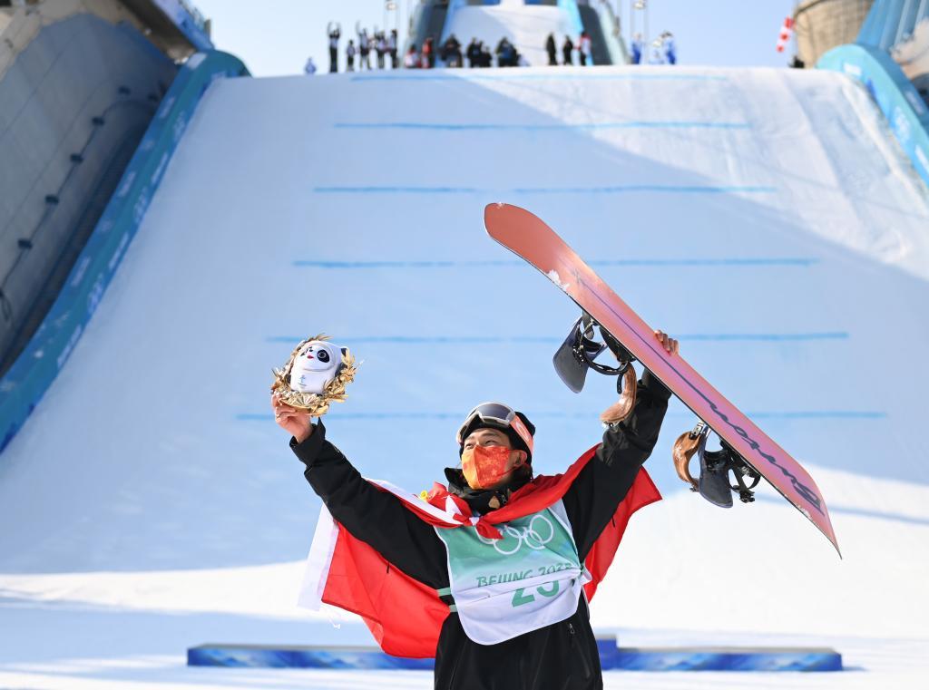 2022年2月15日,中國選手蘇翊鳴在奪得北京冬奧會單板滑雪男子大跳臺冠軍后慶祝。新華社記者 黃宗治 攝
