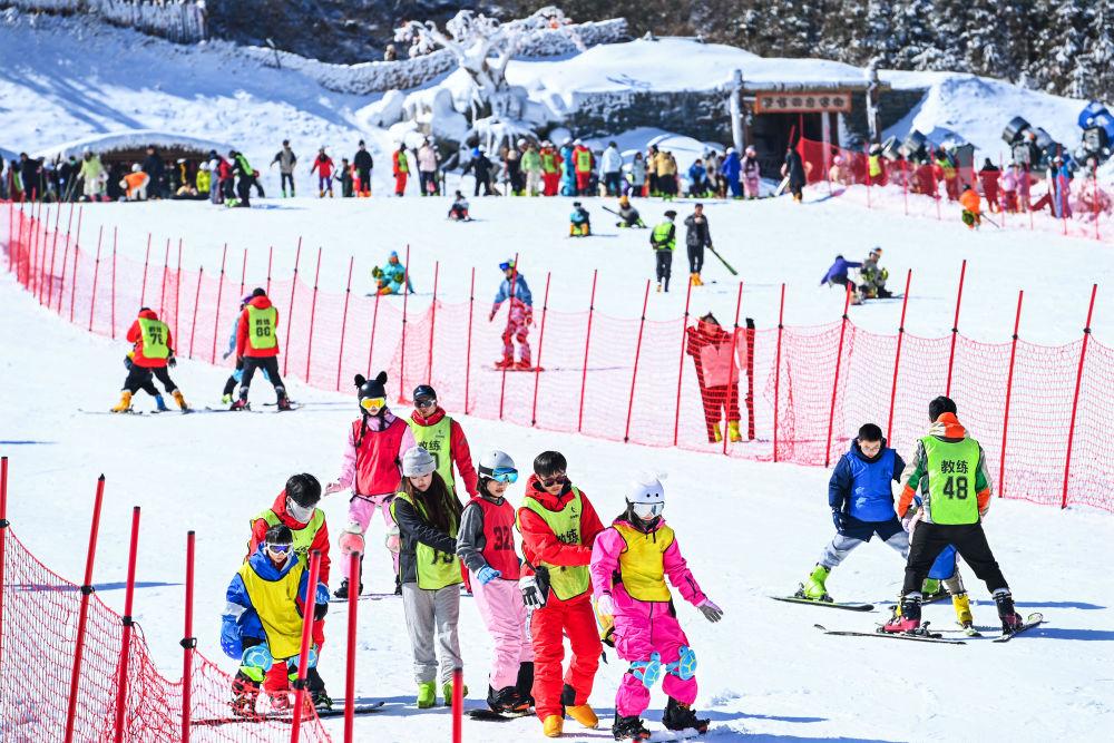 2026年2月2日,在江西省宜春市銅鼓縣排埠鎮(zhèn)七星嶺滑雪場,參加冰雪冬令營的學(xué)生在教練的帶領(lǐng)下體驗冰雪運動。新華社發(fā)(周亮攝)
