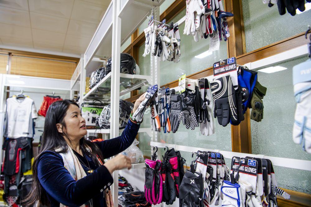 2026年1月6日,這是在廈門博特運動器材有限公司產(chǎn)品展示間,總經(jīng)理葉小玲在介紹公司生產(chǎn)的冰球手套。新華社記者魏培全攝