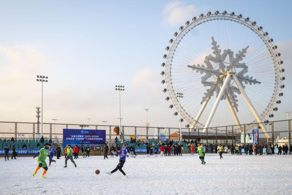 2025年12月20日,參賽球員們在哈爾濱市“冰超”系列冰雪賽事啟動儀式暨“冰雪大世界杯”2025-2026年冰城首屆“冰雪綠茵”大眾雪地足球挑戰(zhàn)賽中。新華社記者張濤攝
