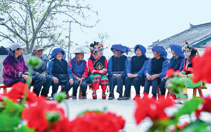 全國(guó)人大代表魯麗華(左五)在云南省南澗彝族自治縣無(wú)量山鎮(zhèn)新政村幸福小院給彝族老人講解養(yǎng)老政策(2025年3月18日攝) 新華社發(fā)(適志宏攝)
