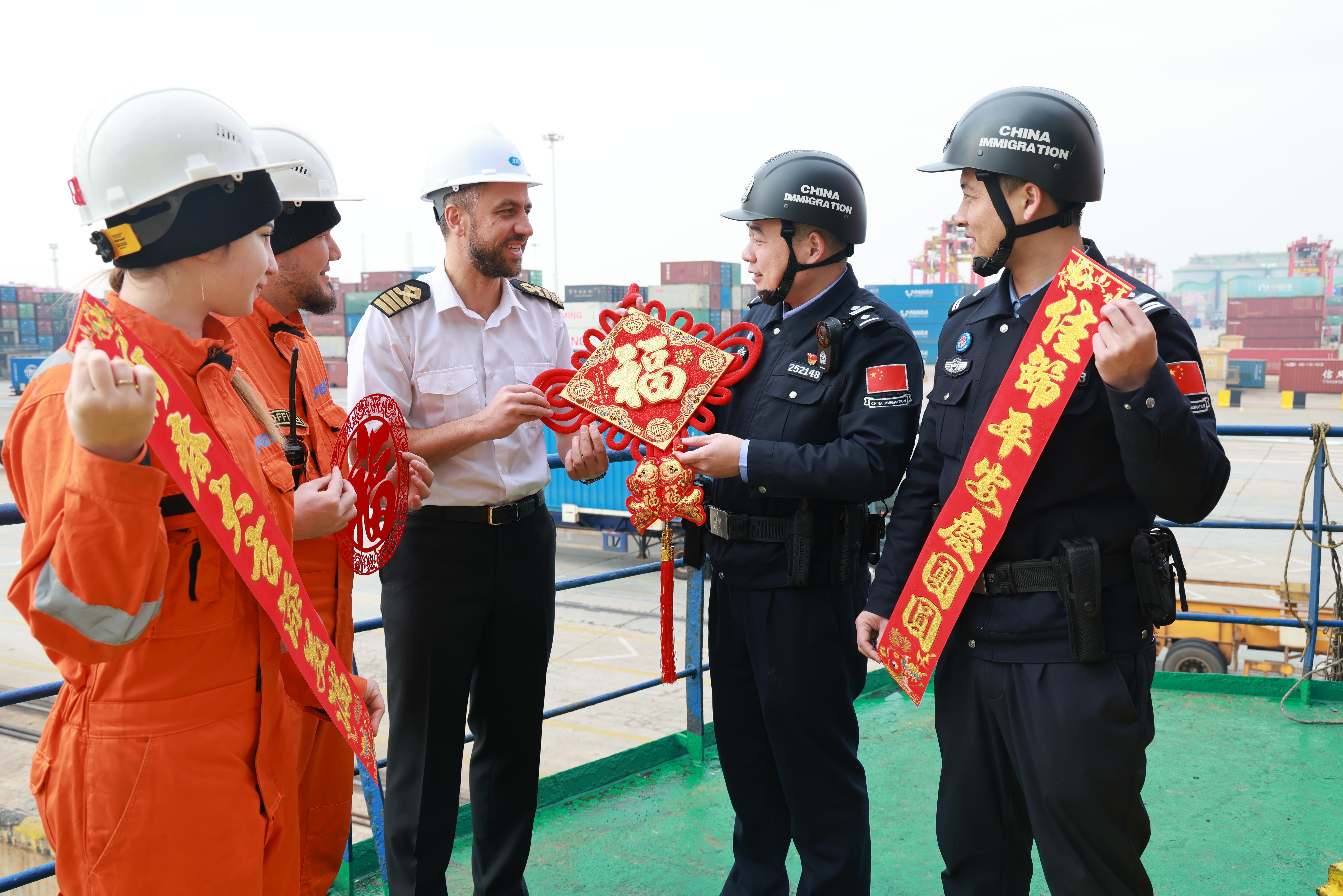 “春節(jié)是我們中國(guó)人最隆重的傳統(tǒng)節(jié)日,這紅彤彤的中國(guó)結(jié),代表著平安、吉祥與美好的祝愿。”執(zhí)勤民警們趁著勤務(wù)間隙,主動(dòng)走上前,向來(lái)自世界各地的船員們介紹春節(jié)的歷史淵源與民俗風(fēng)情,手把手教他們貼春聯(lián)、認(rèn)“?!弊?,用簡(jiǎn)單真誠(chéng)的互動(dòng),打破語(yǔ)言的隔閡,讓異國(guó)船員在遙遠(yuǎn)的國(guó)門口岸,也能感受到中國(guó)春節(jié)的暖意。