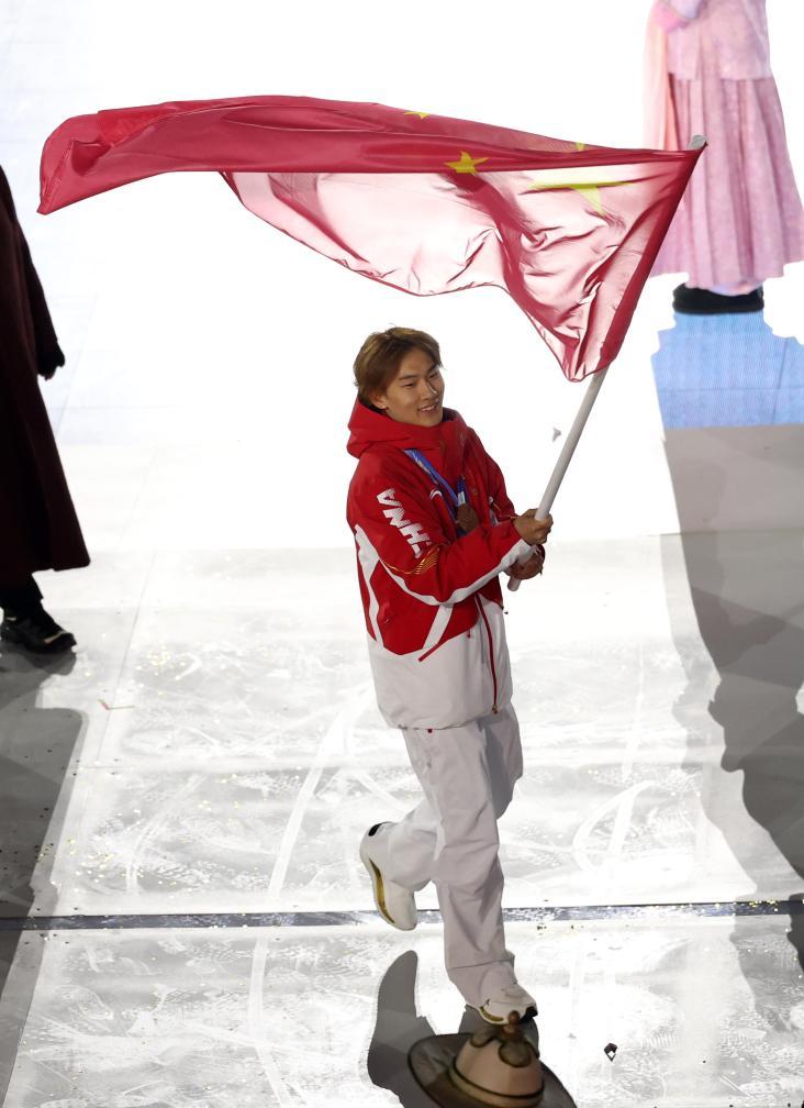 2月22日,中國(guó)體育代表團(tuán)旗手蘇翊鳴在閉幕式上入場(chǎng)。新華社記者 李京 攝