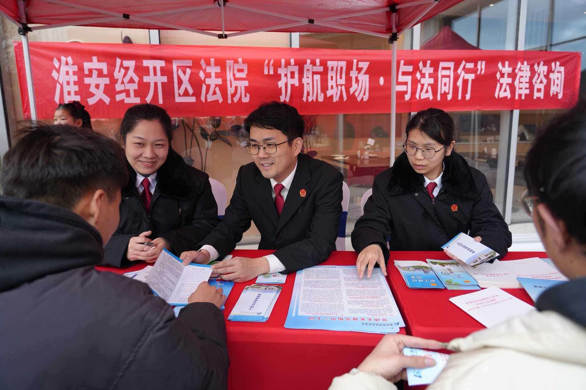當(dāng)天,江蘇省淮安經(jīng)濟技術(shù)開發(fā)區(qū)人民法院勞動爭議調(diào)處法官團隊將司法服務(wù)“直通車”開進了新春招聘會現(xiàn)場。江淮大地年味尚濃,招聘市場人頭攢動,法院的服務(wù)攤位前很快圍滿了求職者。