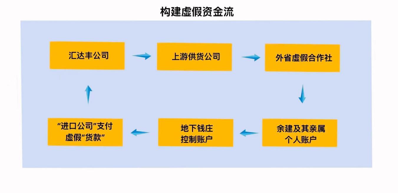 順著這條異常的資金線索深查,一條清晰的虛假循環(huán)路徑浮出水面:匯達豐公司收到外匯或者退稅款后,便迅速以“貨款”名義轉給上游供貨商,上游供貨商隨即轉給合作社,合作社扣除部分費用后,退稅款最終轉入余建親屬的銀行賬戶,外貿貨款則轉入地下錢莊交易人員的賬戶。