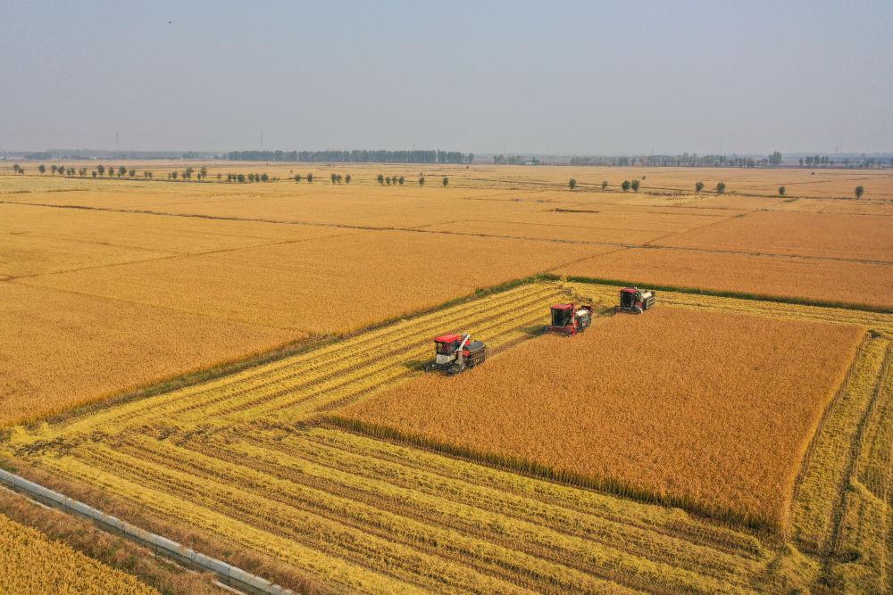 在吉林省公主嶺市,吉林省米兜種植農(nóng)民專業(yè)合作社進行機械化收割水稻作業(yè)展示(2025年10月14日攝,無人機照片)。新華社記者 張楠 攝