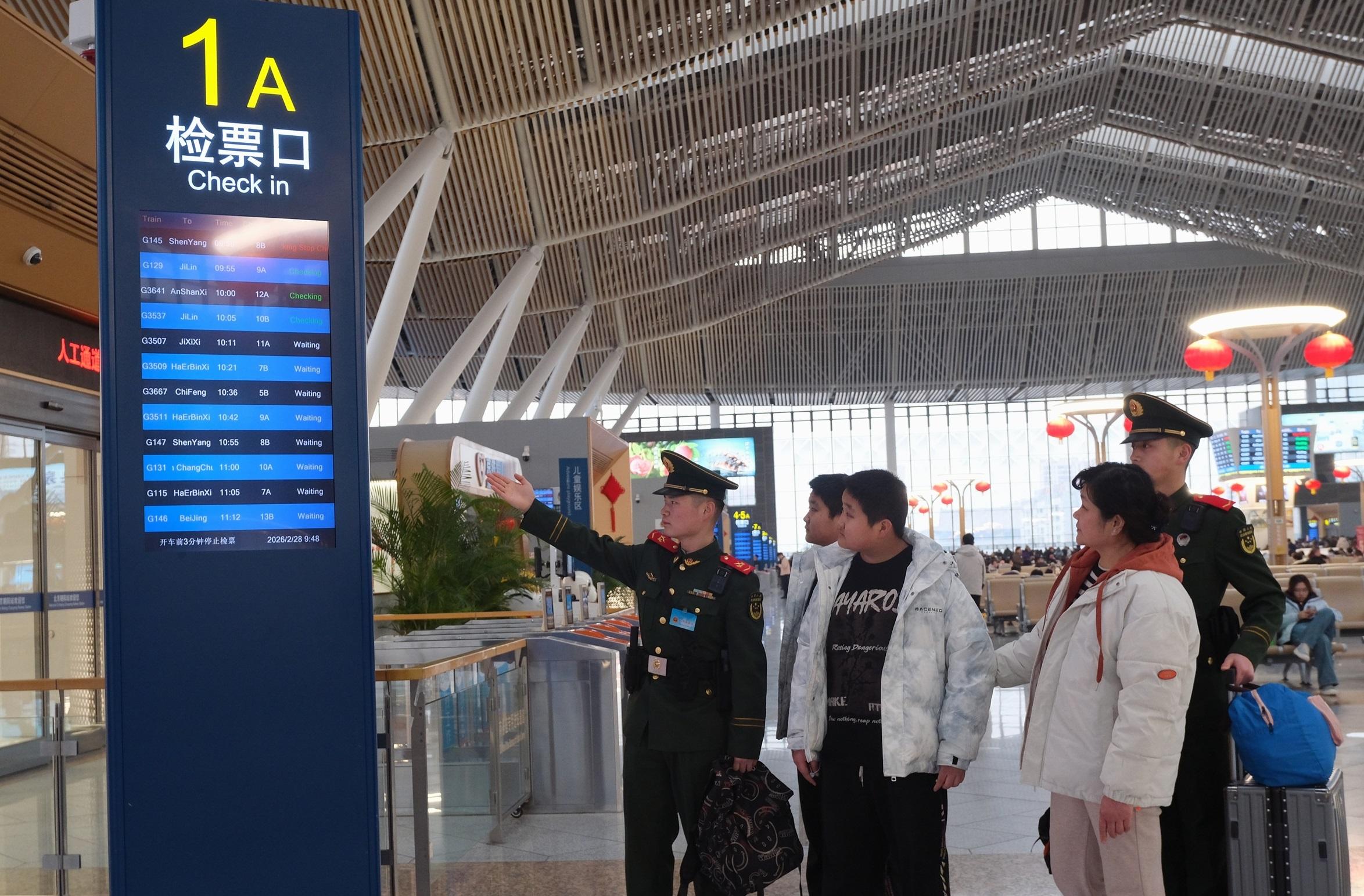 朝陽站旅客眾多,人聲撲面而來。廣播里反復播報著檢票信息,嘈雜的說話聲,行李箱滾輪的咕嚕聲,揉成一片。記者看到,人流密集的進站口、安檢區(qū)、候車大廳、檢票口等關(guān)鍵點位,執(zhí)勤武警始終保持高度警惕,細致排查各類安全隱患。