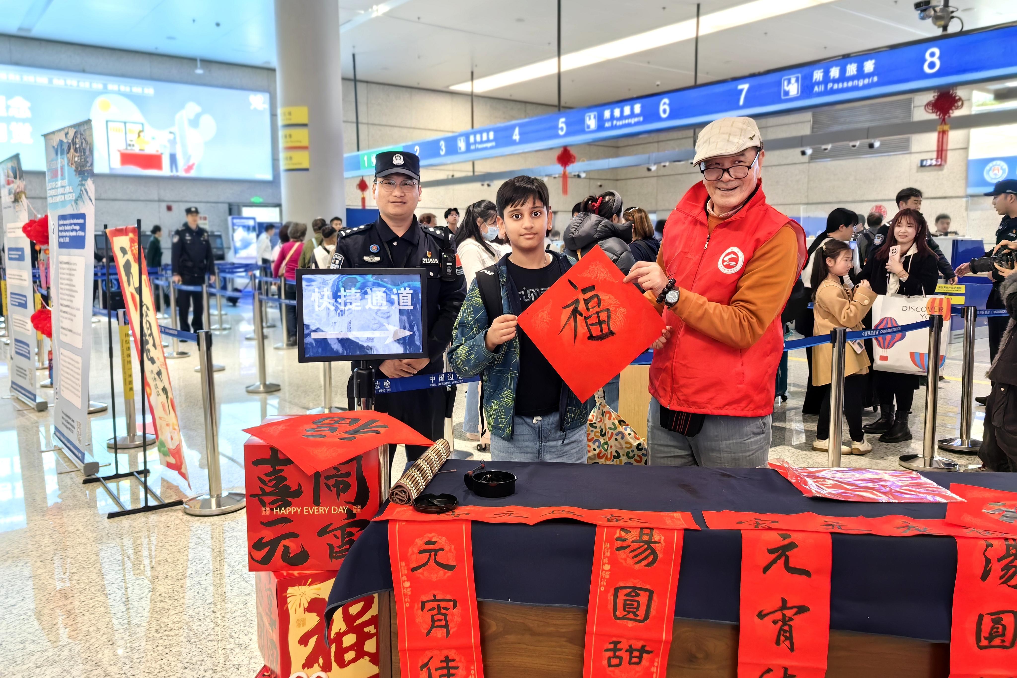 “平時我們在驗證臺上驗放旅客,今天能和大家一起包湯圓、猜燈謎,還看了寫書法,感覺特別有意義?!睂幉C(jī)場邊檢站執(zhí)勤四隊副隊長鮑一峰笑著說,“這不僅是傳統(tǒng)文化的傳承,更是警民一家親的生動體現(xiàn)。”
