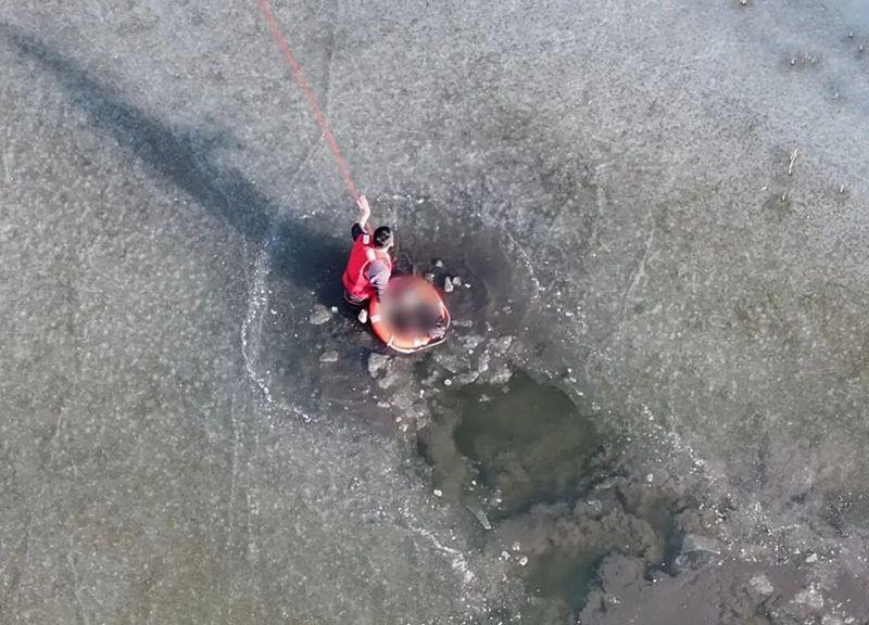 春寒料峭,湖水如刀。吳謹帆沿著邊緣的冰面裂隙游向落水者,每一寸前進,刺骨寒意便如針扎般鉆入骨髓。在無人機的精準指引下,他以最快的直線距離接近目標。其余警力則在岸上緊拽著連接吳謹帆的救生繩,目光緊緊追隨湖中的身影。
