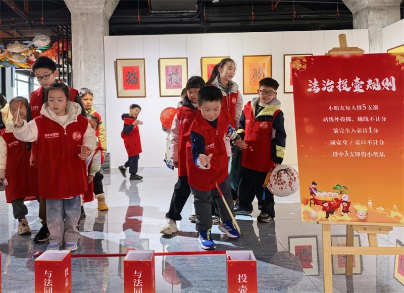 “中了!中了!”不遠(yuǎn)處傳來陣陣歡呼。法治燈謎、法治投壺……傳統(tǒng)游藝項目被注入“法治基因”,瞬間點燃了全場的熱情。孩子們圍著游戲區(qū)躍躍欲試,每完成一個游戲,就能收獲一份普法小禮品,在互動中學(xué)會守法。元宵元素打卡墻則成為熱門拍照點,孩子們舉著花燈定格下團(tuán)圓喜樂的瞬間,分享這份節(jié)日的祥和。