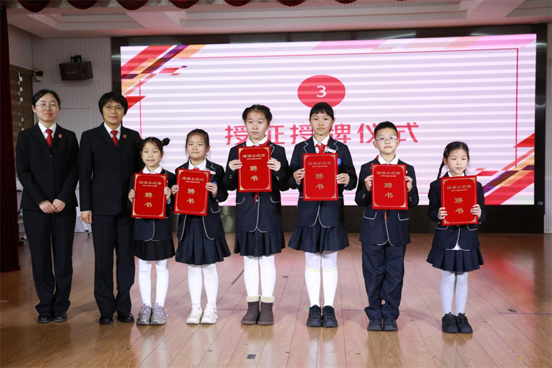 隨后,是莊嚴(yán)而溫暖的授證時(shí)刻。作為錦溪小學(xué)的“法治副校長(zhǎng)”,奉化法院王佩嵐專(zhuān)委來(lái)到孩子們中間,為6名新上任的“法治小記者”逐一頒發(fā)證書(shū)。
