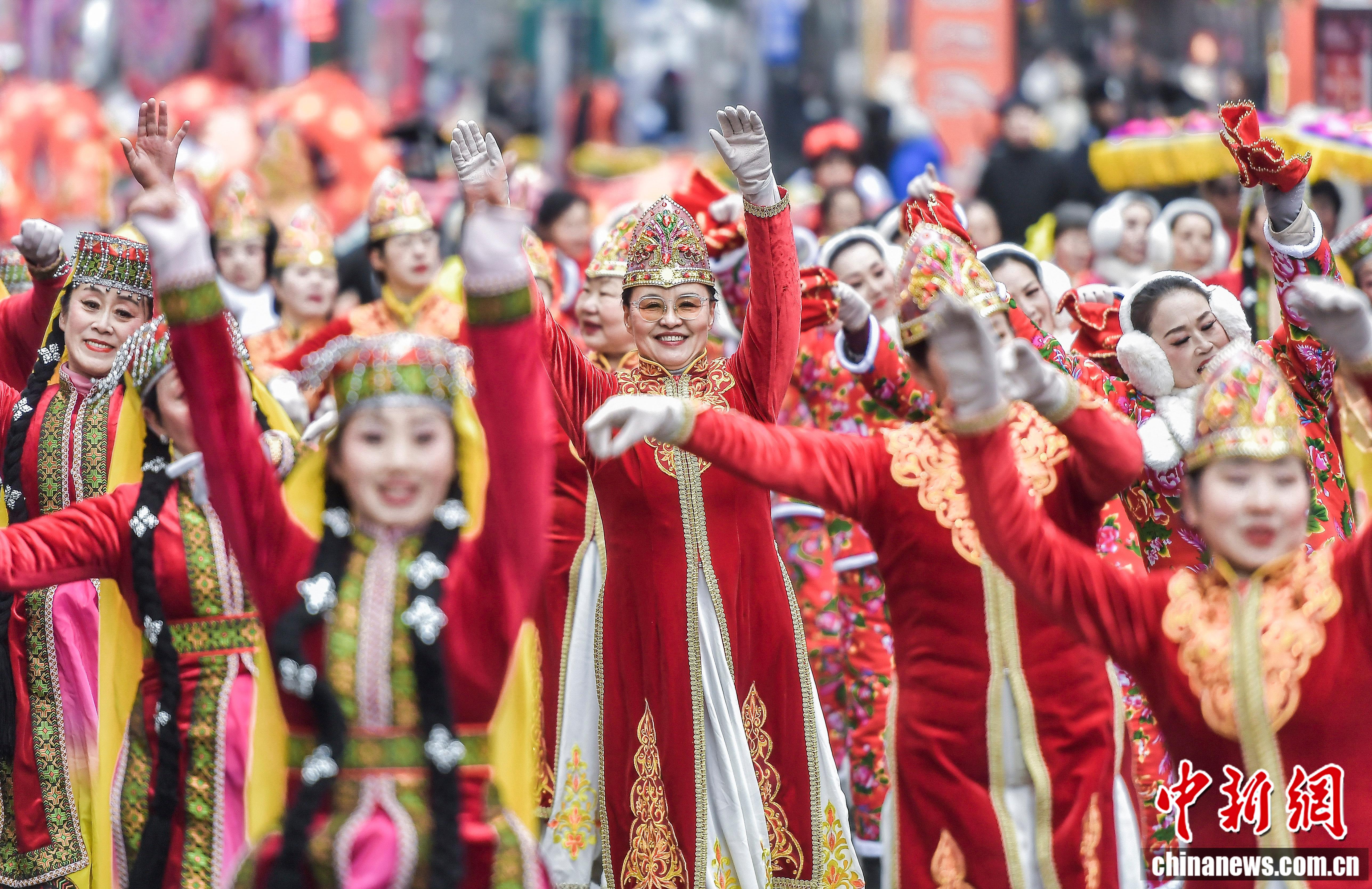 2026年2月5日,新疆烏魯木齊市鬧市區(qū)西門老街鑼鼓喧天,一場(chǎng)社火展演游街活動(dòng)在此舉行,圖為社火隊(duì)伍的服飾、舞蹈等融入諸多新疆元素。中新社記者 劉新 攝