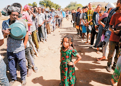 十一月二十八日,在蘇丹靠近埃塞俄比亞的邊境地帶,從提格雷州逃離的埃塞俄比亞難民排隊等待領取食物。新華社/路透