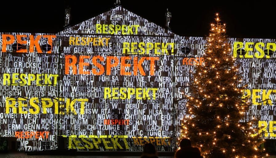 12月17日,在德國(guó)首都柏林,兩名參觀者觀看被“尊重”字樣點(diǎn)亮的德國(guó)總統(tǒng)府。