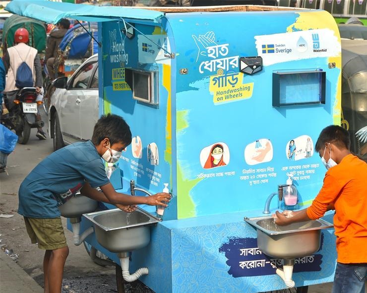 12月21日,在孟加拉國達卡,兩名兒童在一處移動洗手設(shè)施洗手。 孟加拉國衛(wèi)生部門20日公布的數(shù)據(jù)顯示,該國新冠累計確診病例超50萬例。 新華社發(fā)
