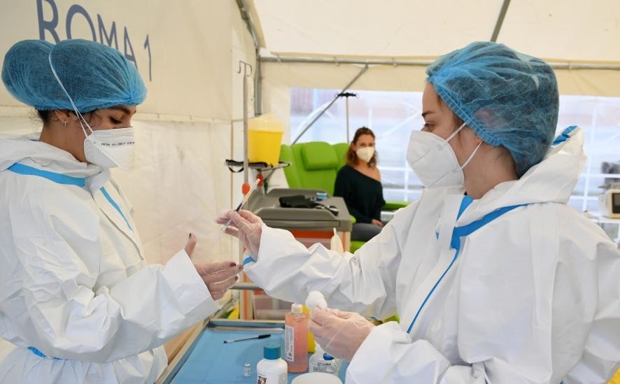12月28日,在意大利羅馬一家醫(yī)院,醫(yī)護(hù)人員準(zhǔn)備進(jìn)行新冠疫苗接種。歐盟多個成員國27日正式啟動新冠疫苗接種工作。首批接種的疫苗由美國輝瑞制藥有限公司與德國生物新技術(shù)公司聯(lián)合研發(fā)。新華社發(fā)(阿爾貝托·林格利亞攝)