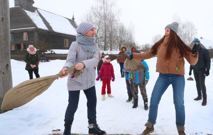 1月24日,年輕人在白俄羅斯首都明斯克郊區(qū)的民族建筑博物館參與傳統(tǒng)的冰雪游戲。新華社發(fā)(任科夫攝)