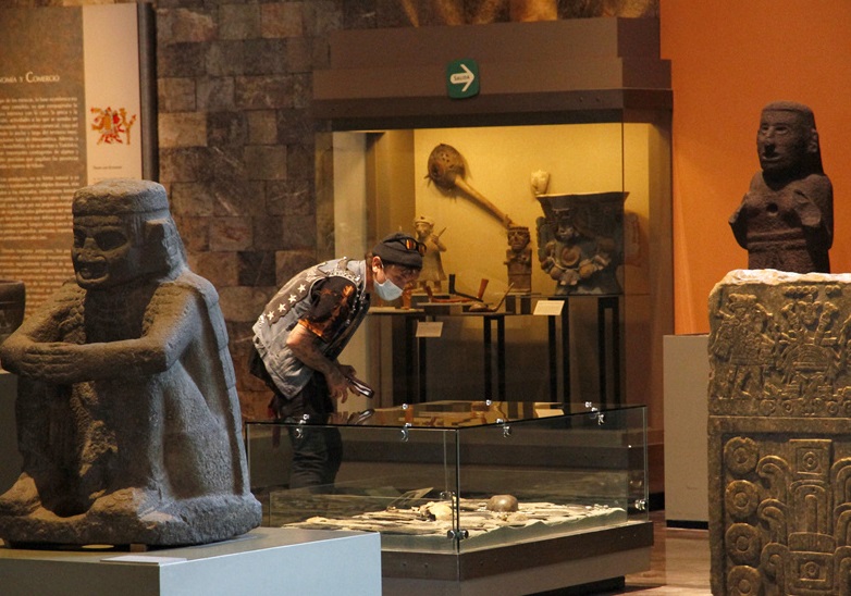 人民網(wǎng)訊 當?shù)貢r間2021年3月11日,墨西哥墨西哥城,墨西哥國立人類學(xué)博物館重新開放,游客戴口罩參觀游覽。