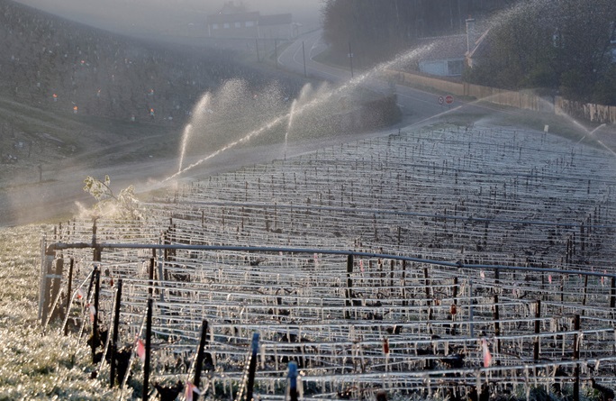 當?shù)貢r間4月7日,法國夏布利郊外,由于霜凍會給種植的葡萄造成重大損傷,當?shù)胤N植者在農(nóng)場中使用自灑水龍頭以保護葡萄。(圖片來源:東方IC)