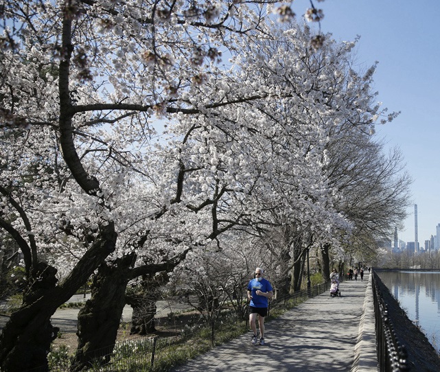 當?shù)貢r間4月8日,美國紐約,中央公園里櫻花盛放,吸引游客觀賞。(圖片來源:東方IC)