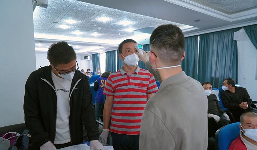 5月5日,一名身處突尼斯的中國公民(中)在突首都突尼斯市一處接種點進行接種新冠疫苗前的體溫檢查。